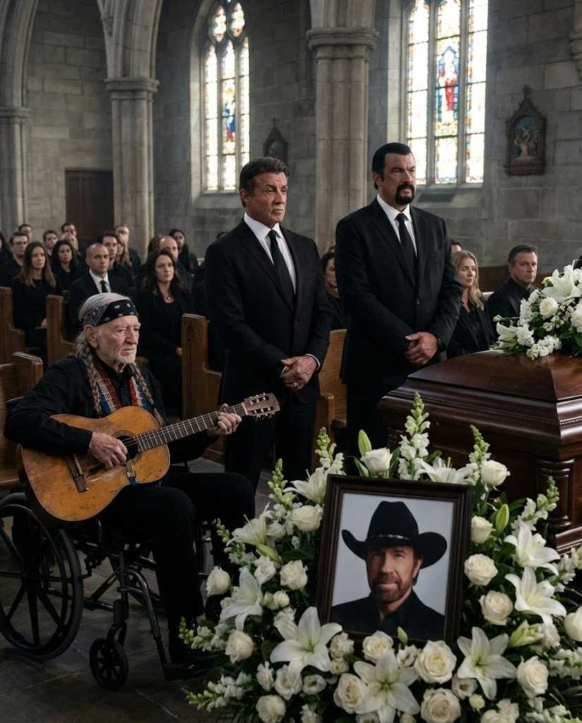 As the service reached its emotional peak, a hush fell over the room. Willie Nelson, Sylvester Stallone, and Steven Seagal, each a titan in their own right, stepped forward. This moment was unexpected; there had been no prior indication that they would take the stage. Yet, their presence spoke volumes about the bond they shared with Norris.